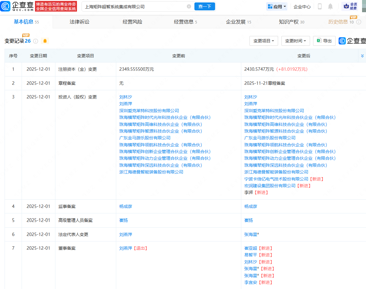 近日,上海矩阵超智系统集成有限公司发生工商变更,新增卡倍亿(300863)、宏润建设(002062)等为股东,注册资本增至约2430.57万元,同时公司高管亦发生变更。企查查显示,上海矩阵超智系统集成有限公司成立于2024年4月股票配资平台代理,现由珠海横琴矩阵创新企业管理合伙企业(有限合伙)、珠海横琴矩阵深远科技合伙企业(有限合伙)及上述新增股东等共同持股。公开信息显示,矩阵超智为人形机器人研发公司。