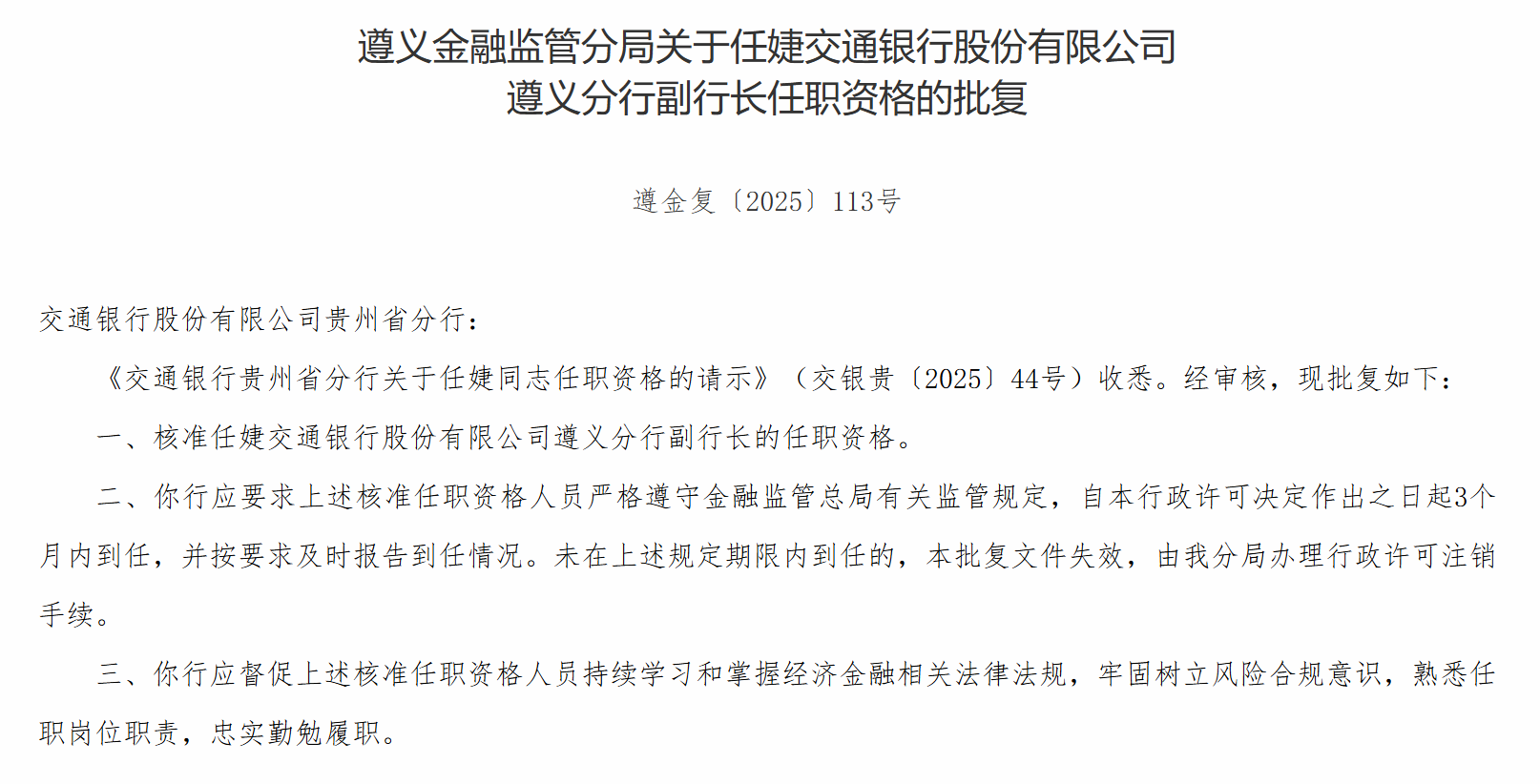 12月3日炒股配资平台,遵义金融监管分局发布关于任婕交通银行股份有限公司遵义分行副行长任职资格的批复,核准任婕交通银行股份有限公司遵义分行副行长的任职资格。